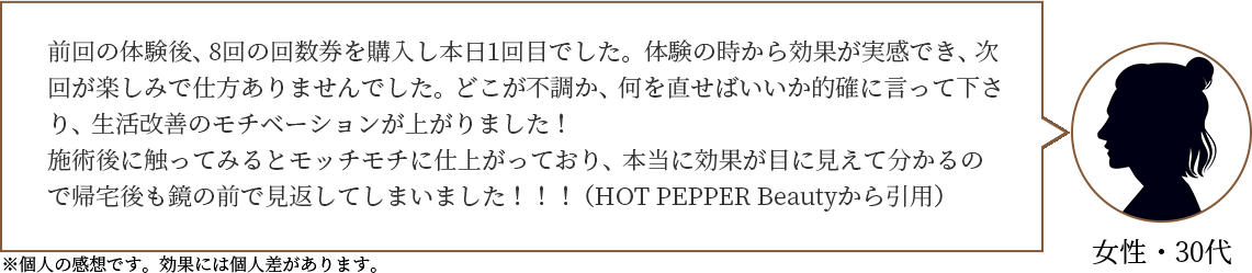 個人差はございますが、1回の施術で目に見える効果を実感いただくこともございます。